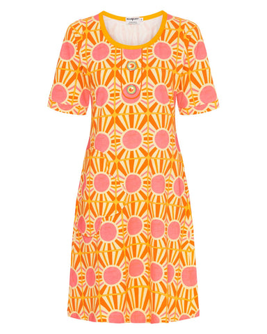Herlig kjole i friske farger i kjent stil fra Margot. Kjolen sitter fint rundt brystet og midjen og løsner nedover kjolen. Den har rund hals med to fine pynteknapper og korte ermer. Margot altså!